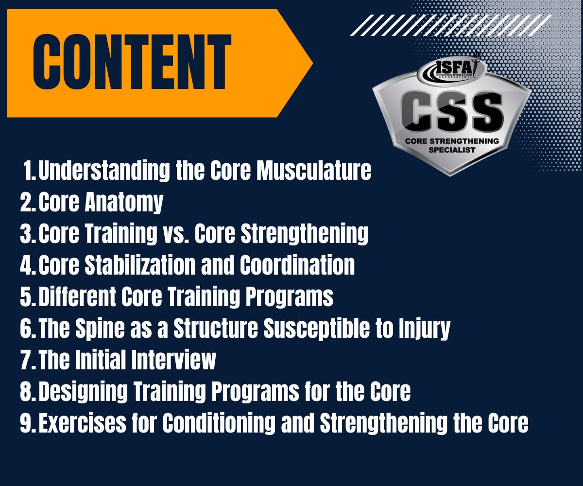 Don’t wait any longer, start studying our course today and become a Core Strengthening Specialist (ISFA-CSS)
