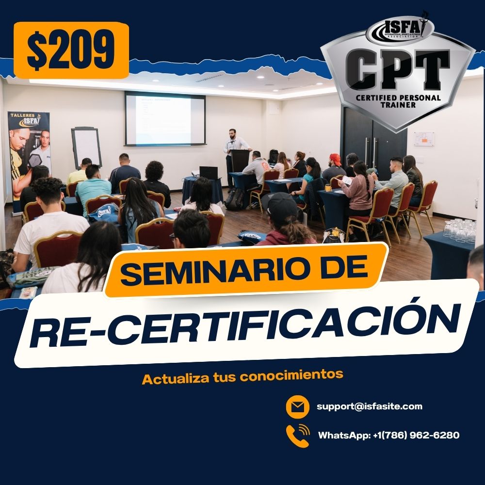 Con nuestro seminario de Entrenador Personal Certificado (ISFA-CPT) tú vas a adquirir el conocimiento más completo y actual sobre Anatomía, Biomecánica, Fisiología, Kinesiología, Nutrición Básica y Prevención de Lesiones, así como también Elaboración e Interpretación de Evaluaciones, Diseño de Programas de Entrenamiento para la población activa y sedentaria, atletas, fisicoculturistas y para aquellos con necesidades especiales (diabéticos, hipertensos, adultos mayores, etc.). Además obtendrás nuevas herramientas y habilidades que te ayudarán a aplicar la información adquirida inmediatamente y así poder comenzar tu propio negocio de entrenamiento personal o si deseas trabajar en un gimnasio o club. No esperes más y únete al selecto grupo de profesionales exitosos en la industria e inscríbete en nuestro seminario para covertirte en Entrenador Personal Certificado por ISFA (ISFA-CPT). Para ver el contenido de nuestro libro de texto haz clic aquí.